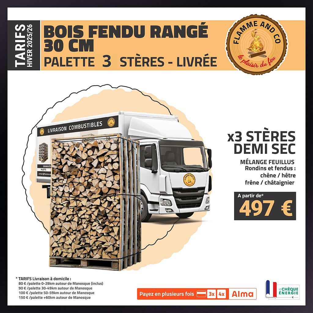 Palette de bûches fendu 30 cm de 1,05m3 = 1,50 stères livrée